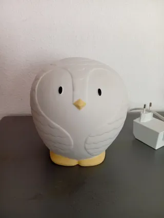 Encantadora lámpara con diseño de búho. - Fabricada en porcelana. - Detalles en color blanco y amarillo.