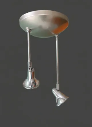 Elegante lámpara de techo con dos focos ajustables. Su diseño moderno combina acabados plateados con detalles en gris mate. - Base circular metálica. - Dos brazos colgantes. - Focos orientables para dirigir la luz.