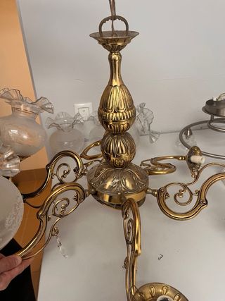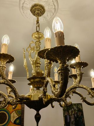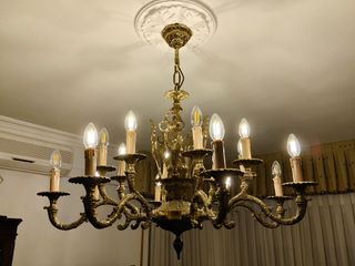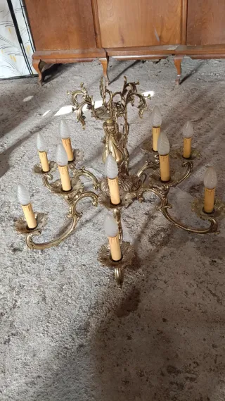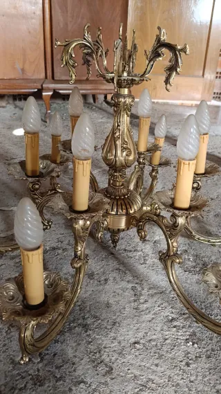 Elegante lámpara de bronce con un diseño clásico y detallado. Perfecta para añadir un toque de distinción a cualquier estancia. - Diez brazos para una iluminación amplia. - Acabado en tono dorado.