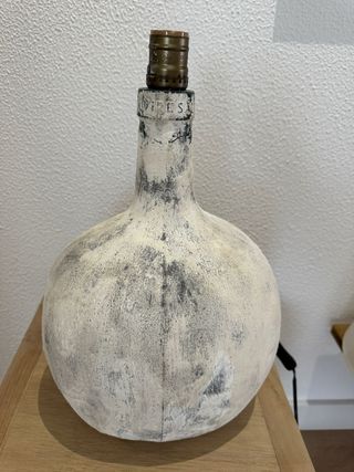 Elegante lámpara de mesa hecha a mano con una base de una botella de dama juana y pantalla de tela. - Base con acabado texturizado en tonos piedra y gris. - Pantalla cónica de tela en color beige. Medidas 55 alto x 26 diametro