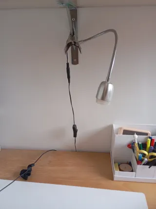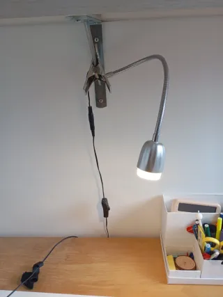Lámpara con pinza para sujetar en mesas o escritorios. Su brazo flexible permite dirigir la luz fácilmente. - Mecanismo de sujeción con pinza. - Brazo articulado para ajustar la posición. - Diseño moderno y funcional.