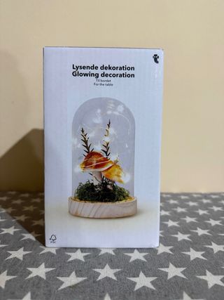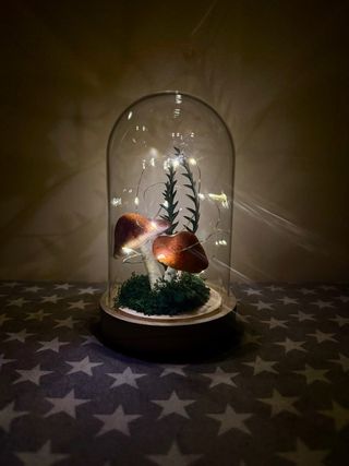 Encantadora lámpara decorativa con un diseño de setas bajo una cúpula de cristal. - Base de madera. - Detalles de musgo y luces LED. - Elementos decorativos de plantas. - En su caja original - 15 cm de alto - No incluye pila