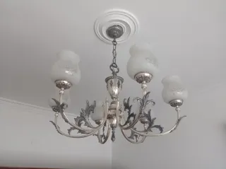 Elegante lámpara de techo con un diseño clásico y detalles ornamentales. Su acabado plateado le da un toque sofisticado. - Estructura principal de metal. - Tulipas de cristal blanco con grabado. - Diseño de 5 brazos.