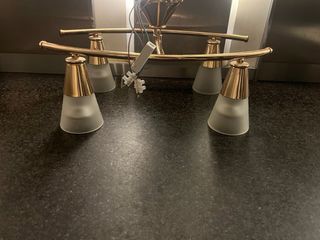 Elegante lámpara de diseño moderno con cuatro puntos de luz. Su acabado combina el brillo del metal dorado con la delicadeza del cristal transparente. - Estructura metálica. - Pantallas de cristal esmerilado.
