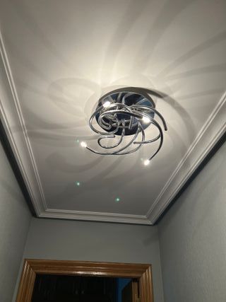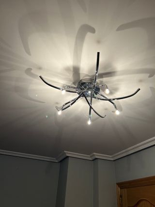 Elegante lámpara de techo con un diseño moderno. En perfecto estado de funcionamiento. Le falta un adorno colgante pero que apenas se nota. - Estructura principal en metal plateado. - Detalles en cristal transparente.