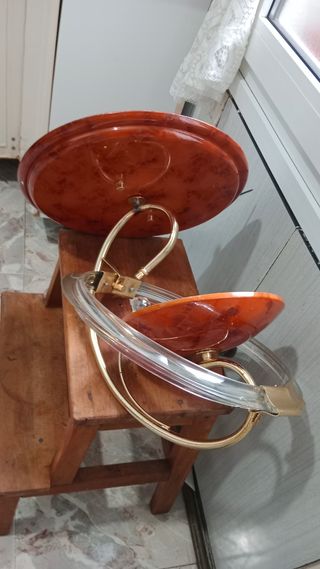 Conjunto de dos lámparas de techo con un diseño elegante. - Acabado en tonos marrones y amarillos. - Combinación de cristal y metal.