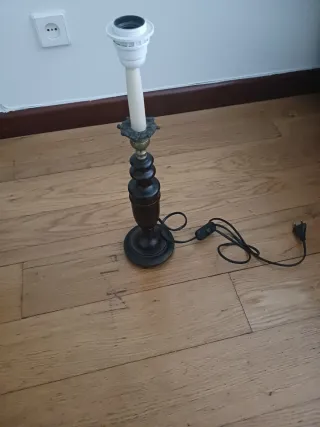 Elegante lámpara de mesa con un diseño clásico y sofisticado. Su base y cuerpo están elaborados con materiales de calidad que le confieren un aspecto distinguido. - Base y cuerpo de madera oscura. - Detalles metálicos dorados en la parte superior. - Acabado que combina tonos marrones y dorados. - 50 cms de alto