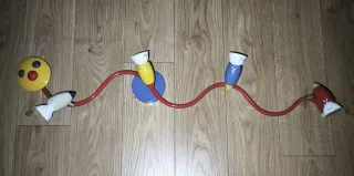 Original lámpara infantil con un diseño divertido y colorido. - Base de montaje azul. - Brazos flexibles en forma de serpiente. - Figuras decorativas en forma de cohete y cara sonriente.