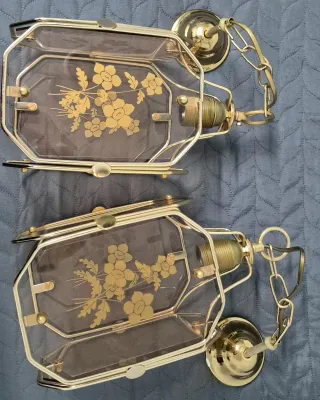 Conjunto de dos lámparas de pared con un diseño único. - Pantallas de cristal con detalles en varios tonos. - Base y soporte de madera. - Estilo decorativo.