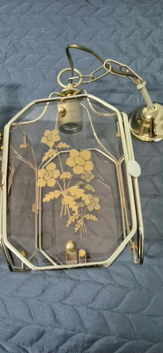 Conjunto de dos lámparas colgantes con un diseño elegante. - Estructura metálica en tono dorado. - Pantallas de cristal transparente con estampado floral. - Cadena para colgar. Precio por los dos .