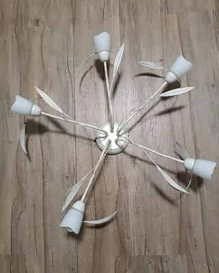 Elegante lámpara de techo con un diseño inspirado en flores y hojas. Es blanca pero tiene ligeros toques dorados. - Estructura metálica. - Tulipanes de cristal. Sólo venta en persona.