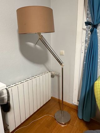 Lámpara de pie con un diseño moderno y funcional. - Estructura metálica. - Pantalla de tela. - Brazo articulado para dirigir la luz. - Necesita pantalla nueva, la que tiene esta un poco fea.