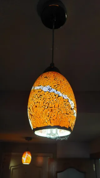Elegante lámpara colgante con un diseño único. - Pantalla de cristal con acabado mosaico. - Detalles en tonos naranjas y blancos. - Base metálica - 2 unidades, precio por unidad, si te llevas las 2 lámparas 40€