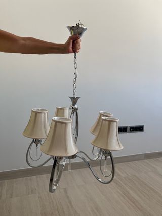 Preciosa lámpara de techo plateada de estilo clásico, comprada en 2021. Ideal para dar un toque de distinción a cualquier espacio. - Tiene cinco tulipas de tela beige. - Estructura metálica plateada de diseño curvado. - Incluye cadena para colgar.