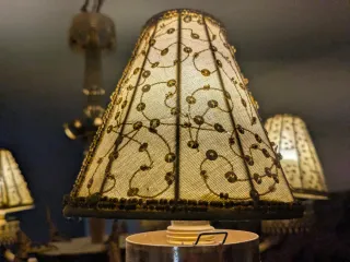 Elegante lámpara de techo con un diseño clásico y detalles ornamentales. - Estructura principal en metal dorado. - Pantallas de tela con un delicado estampado. - Adornos colgantes en la parte inferior.