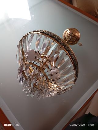 Elegante lámpara de pared con un diseño único. Son 3 lámparas por 45€, pero también se pueden vender por separado - Estructura metálica en tono dorado. - Pantalla de cristal con grabado floral. - Adornos de cristales colgantes.