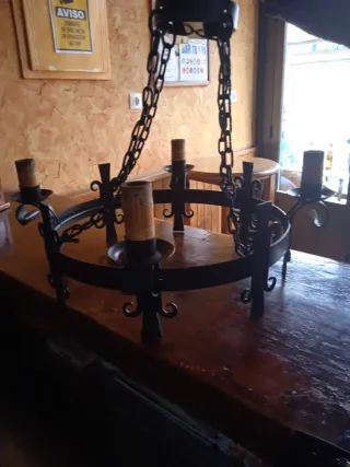 Lámpara de techo de forja con un diseño rústico y elegante. - Estructura principal de metal negro. - Detalles decorativos en madera. - Cadena para colgar.
