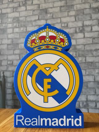 Lámpara decorativa con el escudo del Real Madrid. Ideal para los aficionados del equipo. - Diseño del escudo del Real Madrid. - Base azul con el nombre del equipo. - Medidas: 25 cm de altura y 16 cm de ancho.