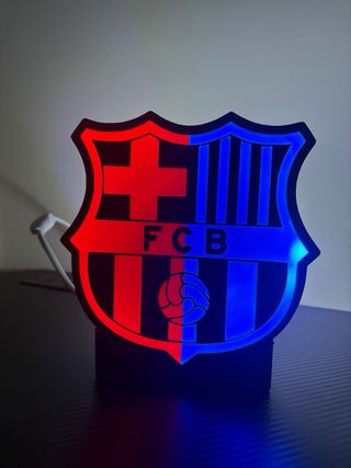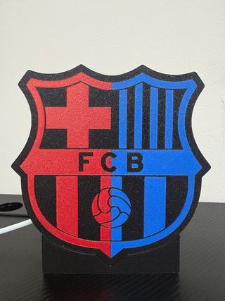 Lámpara decorativa con el escudo del FC Barcelona. - Diseño icónico del club. - Colores azul y rojo característicos. - Base negra para soporte. - Medidas: 18 cm de altura y 17.5cm de ancho