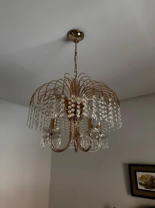 Elegante lámpara de araña con un diseño clásico y detalles en cristal. - Estructura principal en metal dorado. - Cristales transparentes que refractan la luz. - Diseño de dos niveles.