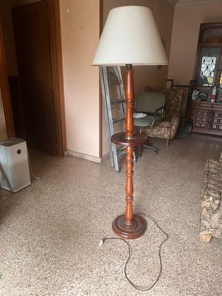 Elegante lámpara de pie con un diseño clásico y funcional. Perfecta para añadir un toque cálido a cualquier rincón. - Fabricada en madera de color marrón. - Pantalla de tela beige. - Incluye una pequeña repisa integrada en el pie.