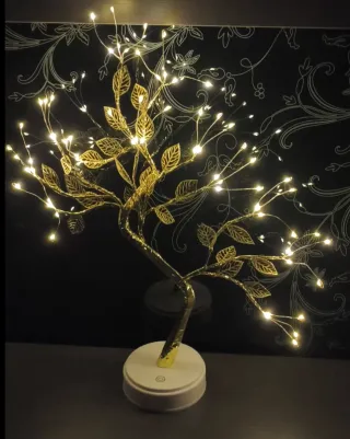Preciosa lámpara decorativa con forma de árbol y hojas doradas, ideal para mesita de noche o como adorno. - Base blanca. - Ramas con luces LED cálidas. - Diseño elegante y moderno.