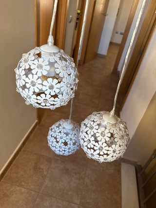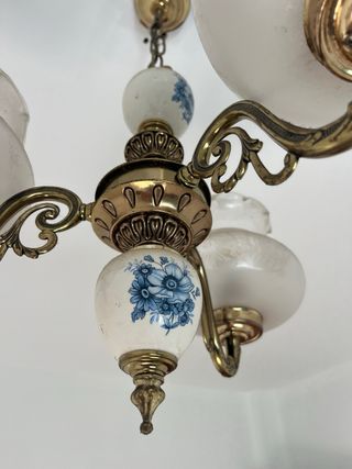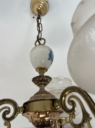 10€ CADA UNA Elegante lámpara de techo con un diseño clásico y detalles decorativos. - Estructura metálica con acabado dorado. - Globos de cristal opalino con grabados. - Elementos centrales de cerámica con motivos florales azules.