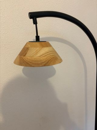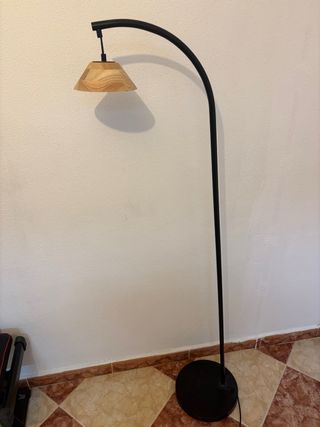 Elegante lámpara de pie con un diseño curvo y un acabado que combina metal y madera. Preguntar sin compromiso, negociable. - Base redonda y estable. - Pantalla con detalles en madera. - Estructura metálica negra.