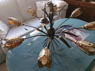 Elegante lámpara de techo con un diseño inspirado en el estilo Tiffany. Sus tulipas de cristal y metal le dan un toque distintivo. - Diseño con múltiples brazos curvos. - Detalles decorativos vegetales.