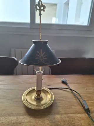 Elegante lámpara de mesa con base de latón y detalles dorados. - Diseño vintage. - Pantalla latón lacada verde carruaje con motivos dorados. - Adorno superior en forma de flor de lis.