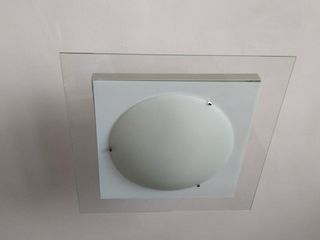 Lámpara de techo con un diseño moderno y elegante. Combina cristal translúcido con detalles metálicos en las esquinas. - Estructura metálica negra. - Paneles de cristal esmerilado. - Adornos metálicos en las esquinas con toques de color.