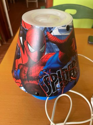 Preciosa lámpara infantil con diseño de Spiderman. Ideal para la habitación de un niño o niña. - Pantalla con estampado de Spiderman - Base azul - Cable blanco