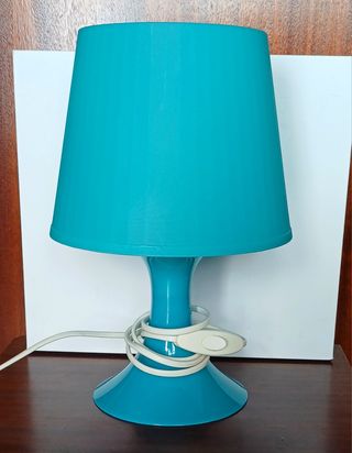 Preciosa lámpara de mesa Ikea Lampan, en color turquesa. Ideal para añadir un toque de color a cualquier espacio. - Base y pantalla en plástico. - Diseño elegante y moderno. - Perfecta para dormitorio o escritorio.