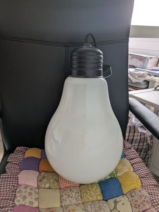 Original lámpara colgante con un diseño único en forma de bombilla gigante. Añade un toque moderno y divertido a cualquier espacio. - Pantalla de cristal blanco. - Base y cableado de plástico negro. En muy buen estado,se quitó porque pusimos lámpara con ventilador.