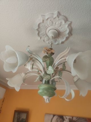 Elegante lámpara de techo con un diseño único. - Estructura principal de hierro forjado. - Detalle de cerámica pintada a mano en los portalámparas. - Cadena para colgar.