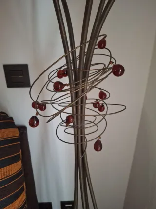 Elegante lámpara de pie con un diseño clásico y detalles decorativos. - Estructura principal de metal. - Adornos de cristal y cuentas rojas. - Base circular decorada.