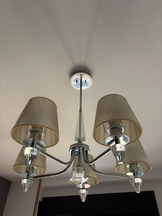 Elegante lámpara de araña con un diseño clásico y detalles en cristal. - Estructura principal en metal dorado. - Cristales colgantes decorativos. - Pantallas de cristal con grabado.
