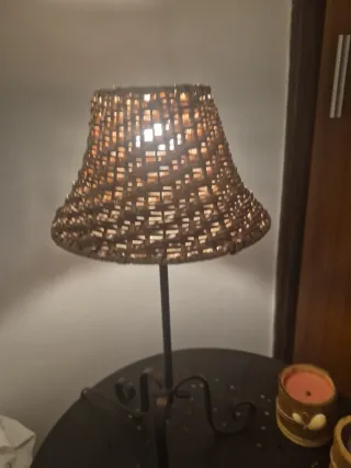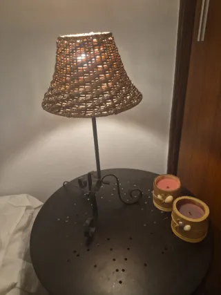 Conjunto de dos lámparas de mesilla con pantallas de mimbre. Añaden un toque cálido y acogedor a cualquier espacio. - Pantallas de mimbre tejidas. - Base de metal con diseño ornamental. - Color natural del mimbre y metal oscuro. Bombilla casquillo fino