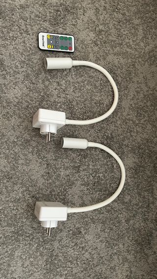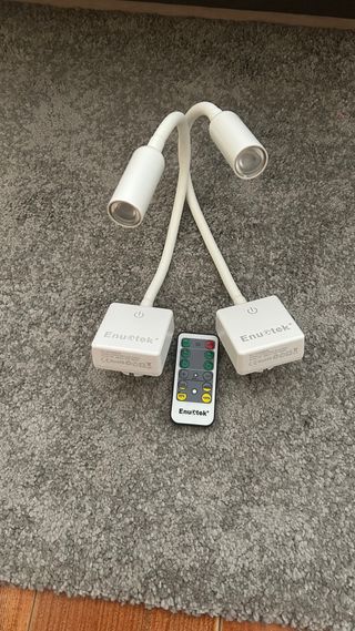 Lámpara LED con dos focos flexibles y control remoto. - Dos cabezales de iluminación ajustables. - Incluye mando a distancia para control. - Diseño moderno y funcional.