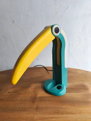 Icónica lampara Tucán de los años 80's. En perfecto estado. Material plástico turquesa verde y pico regulable amarillo. Interruptor en la base. Bombilla fluorescente 9w nueva con su caja. Medidas. 31 cm. Alto x 34 cm. Largo abierto x 13.cm. ancho. Vintage retro deco decoración diseño design estilo style moderno contemporáneo colección collection 70's 80's lamp luz iluminación smlarson