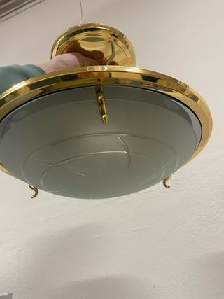 Elegante lámpara de techo con un diseño moderno. - Acabado metálico dorado. - Pantalla de cristal translúcido con detalles. - Aporta un toque sofisticado a cualquier estancia. -La luz está fundida solo hay que poner la bombilla.