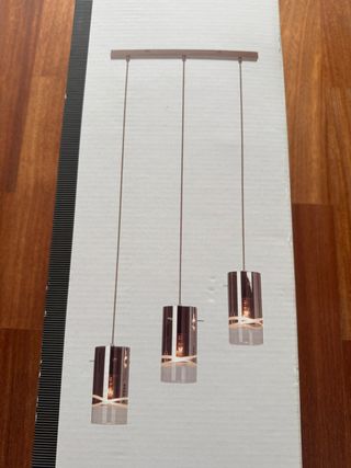 Elegantes lámparas colgantes con un diseño moderno y sofisticado. Aportan un toque de estilo a cualquier espacio. Ideal para comedor o salón. - Conjunto de tres lámparas. - Acabado metálico plateado. - Cilindros de cristal con detalles decorativos. Medidas de las lamparas en foto 6. Se puede ajustar la altura de la tulipa de la lámpara. Bombillas no incluidas. Tornillos incluidos.