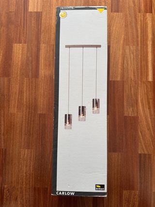 Elegante lámpara colgante con un diseño moderno que combina materiales de calidad. - Estructura principal en metal dorado. - Pantallas de cristal translúcido. - Detalles decorativos en madera.