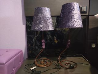 Elegantes lámparas de diseño para mesita de noche. Añaden un toque de estilo a cualquier habitación. Las tulipas de 20cmx (15 a 20) cm. están ligeramente abolladas por si interior, pero por fuera no se nota. Altura de las lámparas 60 cm. Cable de alimentación de 1 metro con interruptor. - Pantallas de terciopelo morado. - Base y pie de metal con acabado en espiral. - Detalle de cuentas moradas en el pie.