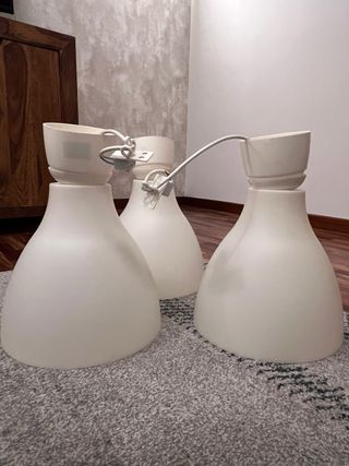 Set de tres lámparas colgantes con un diseño moderno y elegante. - Acabado en color blanco. - Fabricadas en plástico resistente. - Ideales para dar un toque de luz a cualquier estancia. - Diámetro 28cm