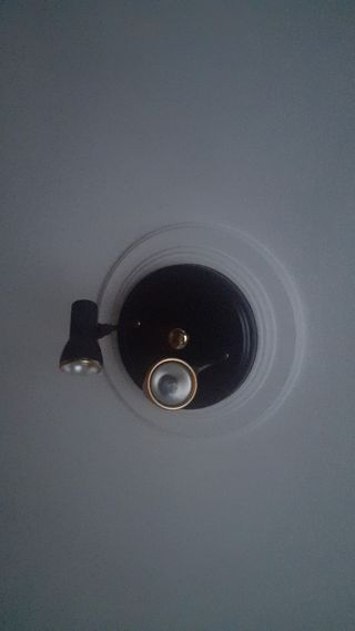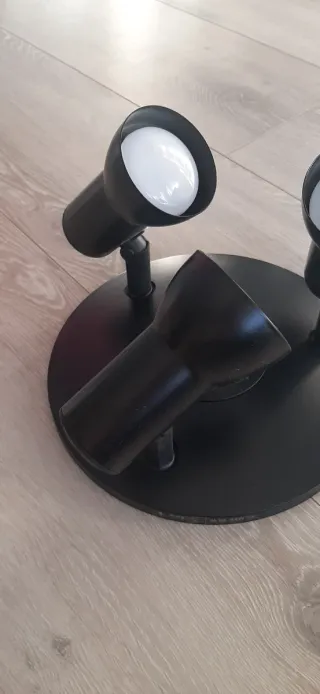 Elegante lámpara de techo con tres focos orientables. Su diseño moderno se adapta a cualquier estancia. - Base redonda. - Acabado en metal negro. Está en perfecto estado.