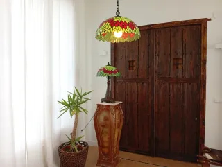 Elegante lámpara de sobremesa con un diseño inspirado en el estilo Tiffany. La pantalla combina vidrios de colores en tonos verdes y rojos, creando un efecto visual muy atractivo. La base está elaborada en metal con un acabado detallado. - Pantalla de cristal con diseño floral. - Base de madera ornamentada.