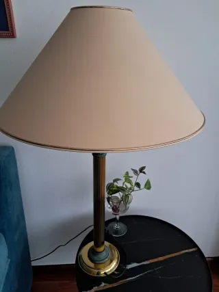 Elegante lámpara de mesa con un diseño clásico y sofisticado. - Pantalla de tela en tono beige. - Base y pie de metal con acabado dorado. - Detalles decorativos en la base y el pie.