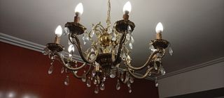 Elegante lámpara de araña con un diseño clásico y detalles en cristal. - 6 brazos / 6 luces tipo vela - Cristales colgantes originales (lágrimas y bola central) - Estructura en metal dorado y brazos de vidrio Funciona perfectamente y está muy bien conservada. 📍Recogida en mano por su fragilidad.