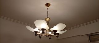 Elegante lámpara de techo de estilo clásico, con un diseño que aporta distinción a cualquier estancia. - Acabado principal en dorado. - Pantallas de cristal blanco con detalles decorativos. - Elementos de madera en la estructura. -5 brazos + luz central inferior - Tulipas de vidrio opal decorado Funciona perfectamente Completa, sin roturas Muy bien conservada